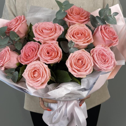 Буукет 11 розовых роз с эвкалиптом | Купить с доставкой в Домодедово