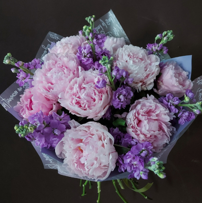Букет собран в очень нежных тоннах. Розовые пионы и сиреневая маттиола.