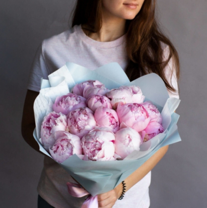 15 светло-розовых пионов Сара Бернар в упаковке с доставкой в Домодедово