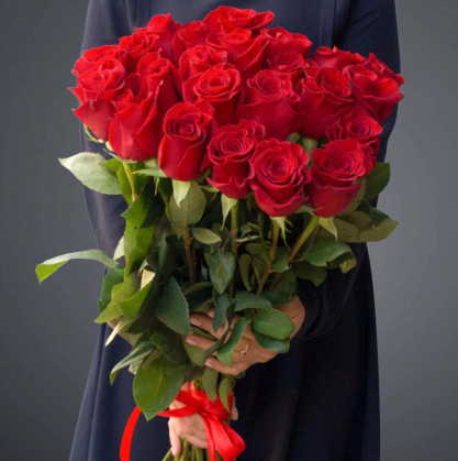 Стоимость букета зависит от количества роз, которое регулируется в меню конструктора с помощью "+/-". При этом, чем больше вы роз заказываете, тем дешевле цена одной розы в букете.