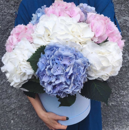 Коробка из разноцветных гортензий с бесплатной доставкой в Домодедово