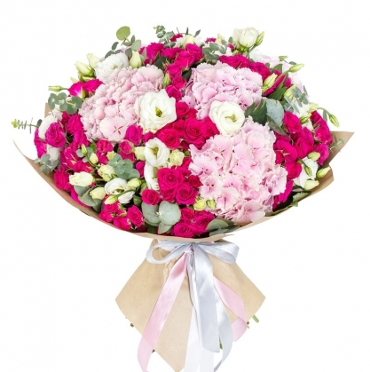 Стильный и красочный букет из гортензий, кустовых роз, эустомы и эвкалипта в крафт упаковке. Непревзойденное сочетание цветов.