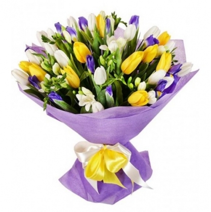 Букет "Три желания" из тюльпанов, ирисов и фрезии | Купить в Домодедово