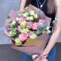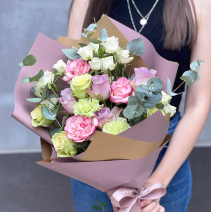 Этот букет - настоящий образец красоты и сочетания разных цветов и текстур. Розовые розы своим ярким цветом создают контраст с мягкостью и нежностью белых цветов, в то время как эвкалипт со своими зелеными листьями добавляет жизненности и динамики.